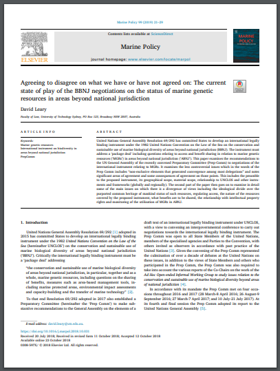 United Nations General Assembly Resolution 69/292 has committed States to develop an international legally binding instrument under the 1982 United Nations Convention on the Law of the Sea on the conservation and sustainable use of marine biological diversity of areas beyond national jurisdiction (BBNJ). The instrument must address a ‘package deal’ including questions relating to access and benefit sharing in relation to marine genetic resources (‘MGRs’) in areas beyond national jurisdiction (‘ABNJ’). This paper examines the recommendations to the UN General Assembly of the recently convened Preparatory Committee (Prep-Comm) to negotiations of the international instrument relating to MGRs. It examines the less controversial issues which in the words of the Prep Comm includes “non-exclusive elements that generated convergence among most delegations” and notes significant areas of agreement and some consequences of agreement on those points. This includes the preamble to the proposed instrument, its geographical scope, material scope, relationship to UNCLOS and other instruments and frameworks (globally and regionally). The second part of the paper then goes on to examine in detail some of the main issues on which there is a divergence of views including the ideological divide over the purported common heritage of mankind status of such resources, regulating access, the nature of the resources covered by the proposed instrument, what benefits are to be shared, the relationship with intellectual property rights and monitoring of the utilization of MGRs in ABNJ.