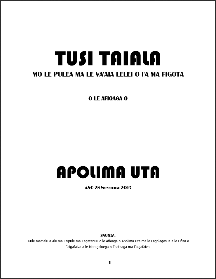 O le afioaga o Apolima Uta e i le itu i matu i sisifo o le motu o Upolu. O lona faitauaofai e tusa ma le 500, eaofia ai matai, tina ma tamaitai, aumaga ma tamaiti. O lenei aofaiga e le o faitaulia ia i latou ua faimalaga atui atunuu i fafo ma aumau ai i Niusila, Ausetalia, Amerika ma isi atunuu.