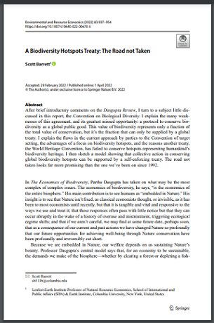 After brief introductory comments on the Dasgupta Review, I turn to a subject little discussed in this report, the Convention on Biological Diversity. I explain the many weaknesses of this agreement, and its greatest missed opportunity: a protocol to conserve biodiversity as a global public good. This value of biodiversity represents only a fraction of the total value of conservation, but it’s the fraction that can only be supplied by a global treaty. I explain the flaws in the current approach by parties to the Convention of target setting, the advantages of a focus on biodiversity hotspots, and the reasons another treaty, the World Heritage Convention, has failed to conserve hotspots representing humankind’s biodiversity heritage. I then sketch a model showing that collective action in conserving global biodiversity hotspots can be supported by a self-enforcing treaty. The road not taken looks far more promising than the one we’ve been on since 1992.
