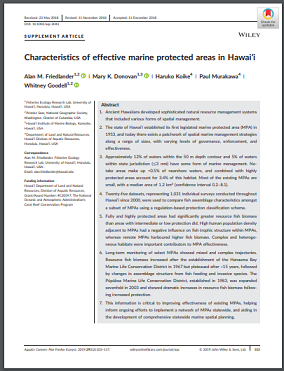 Ancient Hawaiians developed sophisticated natural resource management systems that included various forms of spatial management. The state of Hawaiʻi established its first legislated marine protected area (MPA) in 1953, and today there exists a patchwork of spatial marine management strategies along a range of sizes, with varying levels of governance, enforcement, and effectiveness. Approximately 12% of waters within the 50 m depth contour and 5% of waters within state jurisdiction (≤3 nmi) have some form of marine management. No‐ take areas make up <0.5% of nearshore waters, and combined with highly protected areas account for 3.4% of this habitat. Most of the existing MPAs are small, with a median area of 1.2 km2 (confidence interval 0.2–8.1). Twenty‐five datasets, representing 1,031 individual surveys conducted throughout Hawaiʻi since 2000, were used to compare fish assemblage characteristics amongst a subset of MPAs using a regulation‐based protection classification scheme. Fully and highly protected areas had significantly greater resource fish biomass than areas with intermediate or low protection did. High human population density adjacent to MPAs had a negative influence on fish trophic structure within MPAs, whereas remote MPAs harboured higher fish biomass. Complex and heterogeneous habitats were important contributors to MPA effectiveness. Long‐term monitoring of select MPAs showed mixed and complex trajectories. Resource fish biomass increased after the establishment of the Hanauma Bay Marine Life Conservation District in 1967 but plateaued after ~15 years, followed by changes in assemblage structure from fish feeding and invasive species. The Pūpūkea Marine Life Conservation District, established in 1983, was expanded sevenfold in 2003 and showed dramatic increases in resource fish biomass following increased protection. This information is critical to improving effectiveness of existing MPAs, helping inform ongoing efforts to implement a network of MPAs statewide, and aiding in the development of comprehensive statewide marine spatial planning.