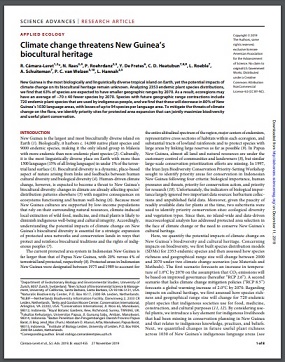 New Guinea is the most biologically and linguistically diverse tropical island on Earth, yet the potential impacts of climate change on its biocultural heritage remain unknown. Analyzing 2353 endemic plant species distributions, we find that 63% of species are expected to have smaller geographic ranges by 2070. As a result, ecoregions may have an average of −70 ± 40 fewer species by 2070. Species with future geographic range contractions include 720 endemic plant species that are used by indigenous people, and we find that these will decrease in 80% of New Guinea’s 1030 language areas, with losses of up to 94 species per language area. To mitigate the threats of climate change on the flora, we identify priority sites for protected area expansion that can jointly maximize biodiversity and useful plant conservation.