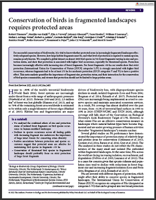 For successful conservation of biodiversity, it is vital to know whether protected areas in increasingly fragmented landscapes effectively safeguard species. However, how large habitat fragments must be, and what level of protection is required to sustain species, remains poorly known. We compiled a global dataset on almost 2000 bird species in 741 forest fragments varying in size and protection status, and show that protection is associated with higher bird occurrence, especially for threatened species. Protection becomes increasingly effective with increasing size of forest fragments. For forest fragments >50 ha our results show that strict protection (International Union for Conservation of Nature [IUCN] categories I–IV) is strongly associated with higher bird occurrence, whereas fragments had to be at least 175 ha for moderate protection (IUCN categories V and VI) to have a positive effect. This meta-analysis quantifies the importance of fragment size, protection status, and their interaction for the conservation of bird species communities, and stresses that protection should not be limited to large pristine areas.