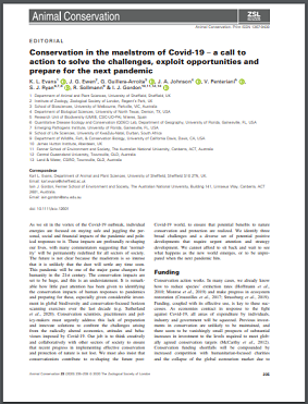 As we sit in the vortex of the Covid-19 outbreak, individual energies are focused on staying safe and juggling the personal, social and financial impacts of the pandemic and political responses to it. These impacts are profoundly re-shaping our lives, with many commentators suggesting that ‘normality’ will be permanently redefined for all sectors of society. The future is not clear because the maelstrom is so intense that it is unlikely that the dust will settle any time soon. This pandemic will be one of the major game changers for humanity in the 21st century. The conservation impacts are set to be huge, and this is an understatement. It is remarkable how little past attention has been given to identifying the conservation impacts of human responses to pandemics and preparing for these, especially given considerable investment in global biodiversity and conservation-focused horizon scanning exercises over the last decade...