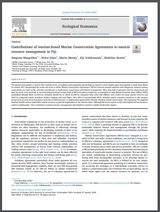 The marine environment is vital for Fiji's tourism sector, yet industry and community partnerships to conserve it have largely gone unrecognised. A study from March to October 2017 documented the extent and scale to which ‘Marine Conservation Agreements’ (MCAs) between tourism operators and indigenous, resource owning communities are used in Fiji, and their contribution to biodiversity conservation and fisheries management. More than half of operators (69.1%) interviewed had been involved, were involved, or were becoming involved, in some form of MCA, focused on temporary or permanent no-take Marine Protected Areas (MPAs). MPAs established through MCAs covered an estimated 26,625 ha, of which 21,000 ha comprised deep water and offshore reefs within two large marine reserves, and 5625 ha comprised mostly nearshore shallow fringing reefs and slopes. Only 28% of tourism-based MCAs included explicit economic incentives to the resource owners such as some level of payment, provision of infrastructure, or employment opportunities directly related to marine conservation. The remaining 72% supplied broader benefits such as sustainable marine resources or general employment in the tourism sector. Although MCAs are in place in Fiji with implied and not formal or explicit conditionality, they contribute to natural resource management and should be counted in global biodiversity targets.