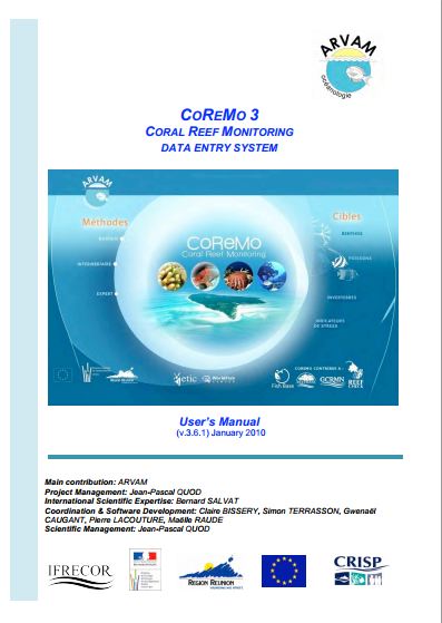 Quod, JP., Salvat, B.; Bissery, C., Terrasson, S., Caugant, G., Lacouture, P., Raude, M. 2010. CoReMo Coral Reef Monitoring Data Entry System 2 v3.6.1. ARVAM Oceanology