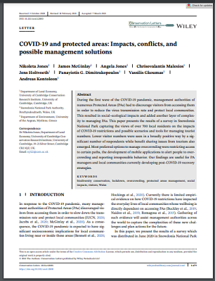 During the first wave of the COVID-19 pandemic, management authorities of numerous Protected Areas (PAs) had to discourage visitors from accessing them in order to reduce the virus transmission rate and protect local communities. This resulted in social–ecological impacts and added another layer of complexity to managing PAs. This paper presents the results of a survey in Snowdonia National Park capturing the views of over 700 local residents on the impacts of COVID-19 restrictions and possible scenarios and tools for managing tourist numbers. Lower visitor numbers were seen in a broadly positive way by a significant number of respondents while benefit sharing issues from tourism also emerged. Most preferred options to manage overcrowding were restricting access to certain paths, the development of mobile applications to alert people to overcrowding and reporting irresponsible behavior. Our findings are useful for PA managers and local communities currently developing post-COVID-19 recovery strategies.