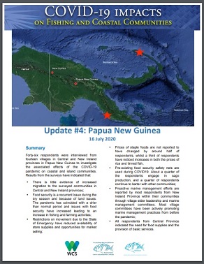 Papua New Guinea (PNG), the largest of the Pacific island nations (population 8.9 million), has not been spared from the COVID-19 pandemic. The government declared a State of Emergency in March, closing off international borders and suspending domestic air travel. Schools were closed, non-essential workers requested to stay at home, and travel between provinces limited to cargo, medicine and security personnel. The general population has been significantly affected and documenting these effects can assist in determining the best way forward for coastal communities in rural PNG. A rapid response survey questionnaire was designed to investigate the initial effects the COVID-19 pandemic has had on coastal and island communities. Staff from the Papua New Guinea Centre for Locally Managed Areas (PNG CLMA) in Central Province (popn. 270,000) and the Wildlife Conservation Society Papua New Guinea program (WCS PNG) in New Ireland Province (popn. 194,000) conducted interviews with male, female and youth key informants to gather more information on impacts that may be associated factors arising from the COVID-19 pandemic. Forty-six respondents were interviewed from fourteen villages in Central and New Ireland provinces in Papua New Guinea to investigate the associated effects of the COVID-19 pandemic on coastal and island communities.