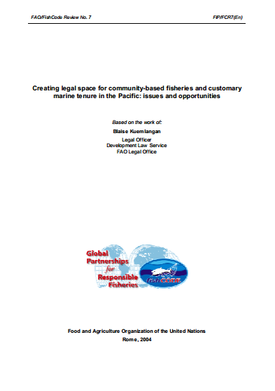 Kuemlangan, B. 2004. Creating Legal Space for Community-based Fisheries and Customary Marine Tenure in the Pacific: Issues and Opportunities. FishCode Review. No. 7 (En). Rome, FAO.