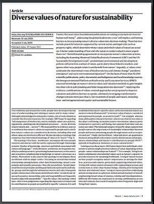 Twenty-five years since foundational publications on valuing ecosystem services for human well-being addressing the global biodiversity crisis still implies confronting barriers to incorporating nature’s diverse values into decision-making. These barriers include powerful interests supported by current norms and legal rules such as property rights, which determine whose values and which values of nature are acted on. A better understanding of how and why nature is (under)valued is more urgent than ever. Notwithstanding agreements to incorporate nature’s values into actions, including the Kunming-Montreal Global Biodiversity Framework (GBF) and the UN Sustainable Development Goals, predominant environmental and development policies still prioritize a subset of values, particularly those linked to markets, and ignore other ways people relate to and benefit from nature. Arguably, a ‘values crisis’ underpins the intertwined crises of biodiversity loss and climate change, pandemic emergence and socio-environmental injustices. On the basis of more than 50,000 scientific publications, policy documents and Indigenous and local knowledge sources, the Intergovernmental Platform on Biodiversity and Ecosystem Services (IPBES) assessed knowledge on nature’s diverse values and valuation methods to gain insights into their role in policymaking and fuller integration into decisions. Applying this evidence, combinations of values-centred approaches are proposed to improve valuation and address barriers to uptake, ultimately leveraging transformative changes towards more just (that is, fair treatment of people and nature, including inter- and intragenerational equity) and sustainable futures.