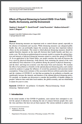 Physical distancing measures are important tools to control disease spread, especially in the absence of treatments and vaccines. While distancing measures can safeguard public health, they also can profoundly impact the economy and may have important indirect effects on the environment. The extent to which physical distancing measures should be applied therefore depends on the trade-offs between their health benefits and their economic costs. We develop an epidemiological-economic model to examine the optimal duration and intensity of physical distancing measures aimed to control the spread of COVID19. In an application to the United States, our model considers the trade-of between the lives saved by physical distancing—both directly from stemming the spread of the virus and indirectly from reductions in air pollution during the period of physical distancing— and the short- and long-run economic costs that ensue from such measures. We examine the effect of air pollution co-benefits on the optimal physical distancing policy and conduct sensitivity analyses to gauge the influence of several key parameters and uncertain model assumptions. Using recent estimates of the association between airborne particulate matter and the virulence of COVID-19, we find that accounting for air pollution co-benefits can significantly increase the intensity and duration of the optimal physical distancing policy. To conclude, we broaden our discussion to consider the possibility of durable changes in peoples’ behavior that could alter local markets, the global economy, and our relationship to nature for years to come.