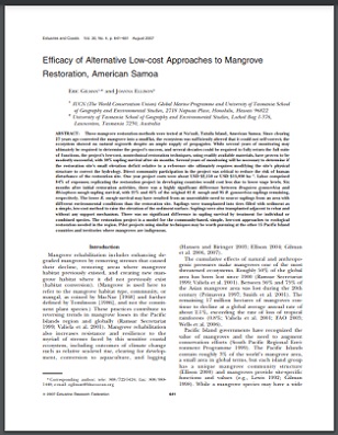 Three mangrove restoration methods were tested at Nu’uuli, Tutuila Island, American Samoa. Since clearing 27 years ago converted the mangrove into a mudflat, the ecosystem was sufficiently altered that it could not self-correct; the ecosystem showed no natural regrowth despite an ample supply of propagules. While several years of monitoring may ultimately be required to determine the project’s success, and several decades could be required to fully return the full suite of functions, the project’s low-cost, nontechnical restoration techniques, using readily available materials, have proven to be modestly successful, with 38% sapling survival after six months. Several years of monitoring will be necessary to determine if the restoration site’s small elevation deficit relative to a reference site ultimately requires modifying the site’s physical structure to correct the hydrology. Direct community participation in the project was critical to reduce the risk of human disturbance of the restoration site. One year project costs were about USD $2,150 or USD $13,030 ha21 . Labor comprised 84% of expenses; replicating the restoration project in developing countries would cost less due to lower wage levels. Six months after initial restoration activities, there was a highly significant difference between Bruguiera gymnorrhiza and Rhizophora mangle sapling survival, with 21% and 45% of the original 42 R. mangle and 95 B. gymnorrhiza saplings remaining, respectively. The lower R. mangle survival may have resulted from an unavoidable need to source saplings from an area with different environmental conditions than the restoration site. Saplings were transplanted into tires filled with sediment as a simple, low-cost method to raise the elevation of the sediment surface. Saplings were also transplanted adjacent to rebar and without any support mechanism. There was no significant difference in sapling survival by treatment for individual or combined species. The restoration project is a model for the community-based, simple, low-cost approaches to ecological restoration needed in the region. Pilot projects using similar techniques may be worth pursuing at the other 15 Pacific Island countries and territories where mangroves are indigenous.