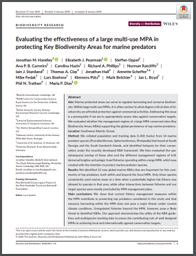 Marine protected areas can serve to regulate harvesting and conserve biodiversity. Within large multi-use MPAs, it is often unclear to what degree critical sites of biodiversity are afforded protection against commercial activities. Addressing this issue is a prerequisite if we are to appropriately assess sites against conservation targets. We evaluated whether the management regime of a large MPA conserved sites (Key Biodiversity Areas, KBAs) supporting the global persistence of top marine predators. Location: Southwest Atlantic Ocean. We show that current fishery management measures within the MPA contribute to protecting top predators considered in this study and that resource harvesting within the MPA does not pose a major threat—under current climate conditions. Unregulated fisheries beyond the MPA, however, pose a likely threat to identified KBAs. Our approach demonstrates the utility of the KBA guidelines and multispecies tracking data to assess the contributing role of well-designed MPAs in achieving local and internationally agreed conservation targets.