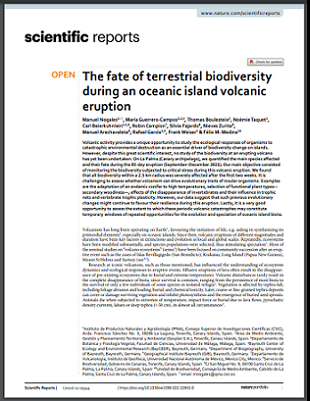Volcanic activity provides a unique opportunity to study the ecological responses of organisms to catastrophic environmental destruction as an essential driver of biodiversity change on islands. However, despite this great scientific interest, no study of the biodiversity at an erupting volcano has yet been undertaken. On La Palma (Canary archipelago), we quantified the main species affected and their fate during the 85-day eruption (September–December 2021). Our main objective consisted of monitoring the biodiversity subjected to critical stress during this volcanic eruption. We found that all biodiversity within a 2.5 km radius was severely affected after the first two weeks. It is challenging to assess whether volcanism can drive evolutionary traits of insular organisms. Examples are the adaptation of an endemic conifer to high temperatures, selection of functional plant types—secondary woodiness—, effects of the disappearance of invertebrates and their influence in trophic nets and vertebrate trophic plasticity. However, our data suggest that such previous evolutionary changes might continue to favour their resilience during this eruption. Lastly, it is a very good opportunity to assess the extent to which these periodic volcanic catastrophes may constitute temporary windows of repeated opportunities for the evolution and speciation of oceanic island biota.