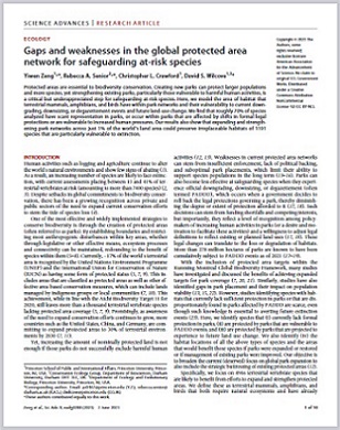 Protected areas are essential to biodiversity conservation. Creating new parks can protect larger populations and more species, yet strengthening existing parks, particularly those vulnerable to harmful human activities, is a critical but underappreciated step for safeguarding at-risk species. Here, we model the area of habitat that terrestrial mammals, amphibians, and birds have within park networks and their vulnerability to current downgrading, downsizing, or de-gazettement events and future land-use change. We find that roughly 70% of species analyzed have scant representation in parks, or occur within parks that are affected by shifts in formal legal protections or are vulnerable to increased human pressures. Our results also show that expanding and strengthening park networks across just 1% of the world’s land area could preserve irreplaceable habitats of 1191 species that are particularly vulnerable to extinction.