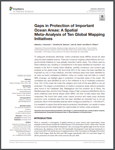To safeguard biodiversity effectively, marine protected areas (MPAs) should be sited using the best available science. There are numerous ongoing United Nations and nongovernmental initiatives to map globally important marine areas. The criteria used by these initiatives vary, resulting in contradictions in the areas identified as important. Our analysis is the first to overlay these initiatives, quantify consensus, and conduct gap analyses at the global scale. We found that 55% of the ocean has been identified as important by one or more initiatives, and that individual areas have been identified by as many as seven overlapping initiatives. Using our overlay map and data on current MPA coverage, we highlight gaps in protection of important areas of the ocean. We considered any area identified by two to four initiatives to be of moderate consensus. Over 14% of the ocean fell under this category and most of this area (88%) is not yet protected. The largest concentrations of medium-consensus areas without protection were found in the Caribbean Sea, Madagascar and the southern tip of Africa, the Mediterranean Sea, and the Coral Triangle. Areas of high consensus (identified by five to seven initiatives) were almost always within MPAs, but their no-take status was often unreported. We found that nearly every marine province and nearly every exclusive economic zone contained area that has been identified as important but is not yet protected. Much of the identified area lies within contiguous stretches of >100,000 km2 ; it is unrealistic to expect that all this area be protected. Nonetheless, our results on areas of consensus provide initial insight into opportunities for further ocean protection.