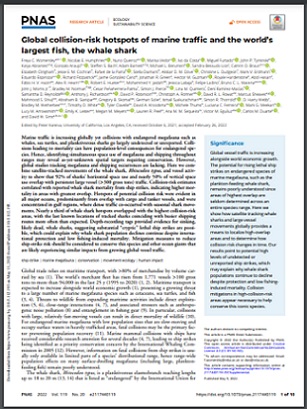 Marine traffic is increasing globally yet collisions with endangered megafauna such as whales, sea turtles, and planktivorous sharks go largely undetected or unreported. Collisions leading to mortality can have population-level consequences for endangered species. Hence, identifying simultaneous space use of megafauna and shipping throughout ranges may reveal as-yet-unknown spatial targets requiring conservation. However, global studies tracking megafauna and shipping occurrences are lacking. Here we combine satellite-tracked movements of the whale shark, Rhincodon typus, and vessel activity to show that 92% of sharks’ horizontal space use and nearly 50% of vertical space use overlap with persistent large vessel (>300 gross tons) traffic. Collision-risk estimates correlated with reported whale shark mortality from ship strikes, indicating higher mortality in areas with greatest overlap. Hotspots of potential collision risk were evident in all major oceans, predominantly from overlap with cargo and tanker vessels, and were concentrated in gulf regions, where dense traffic co-occurred with seasonal shark movements. Nearly a third of whale shark hotspots overlapped with the highest collision-risk areas, with the last known locations of tracked sharks coinciding with busier shipping routes more often than expected. Depth-recording tags provided evidence for sinking, likely dead, whale sharks, suggesting substantial “cryptic” lethal ship strikes are possible, which could explain why whale shark population declines continue despite international protection and low fishing-induced mortality. Mitigation measures to reduce ship-strike risk should be considered to conserve this species and other ocean giants that are likely experiencing similar impacts from growing global vessel traffic.
