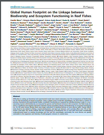 Difficulties in scaling up theoretical and experimental results have raised controversy over the consequences of biodiversity loss for the functioning of natural ecosystems. Using a global survey of reef fish assemblages, we show that in contrast to previous theoretical and experimental studies, ecosystem functioning (as measured by standing biomass) scales in a nonsaturating manner with biodiversity (as measured by species and functional richness) in this ecosystem. Our field study also shows a significant and negative interaction between human population density and biodiversity on ecosystem functioning (i.e., for the same human density there were larger reductions in standing biomass at more diverse reefs). Human effects were found to be related to fishing, coastal development, and land use stressors, and currently affect over 75% of the world’s coral reefs. Our results indicate that the consequences of biodiversity loss in coral reefs have been considerably underestimated based on existing knowledge and that reef fish assemblages, particularly the most diverse, are greatly vulnerable to the expansion and intensity of anthropogenic stressors in coastal areas.