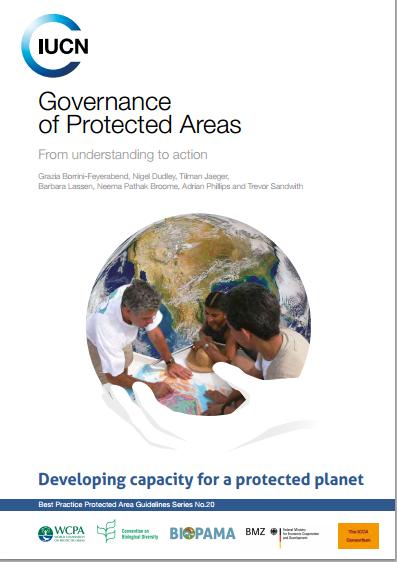 Borrini-Feyerabend, G., Dudley, N. Jaeger, T., Lassen, B., Pathak Broome, N., Phillips, A. and Sandwith, T. 2013. Governance of Protected Areas: From Understanding to Action. Best Practice Protected Area Guidelines Series No. 20, Gland, Switzerland.