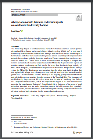 The Milne Bay Region of southeasternmost Papua New Guinea comprises a small portion of mainland New Guinea and several offshore islands, totaling 15,000 km2 in land area. I numerically summarize the literature and fndings from my feld surveys of the region’s herpetofauna and show that it contains the greatest known assemblage of range-restricted endemic herpetofauna globally for such a small area. Further, most of these species occupy only one or two of 11 small areas of local endemism within the region. I compare the number and density of endemic herpetofauna in the Milne Bay Region to other regions of notable endemic biodiversity and fnd it to be far larger than that in the large majority of these other "hotspots", despite the much larger sizes of those areas. Herpetofaunal surveys within the Milne Bay Region are more complete than for other taxa, but it is clear that this region holds a large trove of range-restricted endemic species within less well-studied groups too. The driver of this endemic diversity is the ongoing geological dismemberment and uplift of the region resulting from the opening of the Woodlark Rift. Prior ignorance of the biodiversity importance of this region stems from decades of classifying New Guinea as a "tropical wilderness area", which has deprived that region of the conservation focus accorded the more famous "hotspots". One efect of this is that some of the areas of local endemism identifed here are under immediate pressure for habitat conversion, especially Woodlark Island, which is threatened by both mining and virtually complete conversion to oil palm, posing a high extinction risk for scores of endemic species.