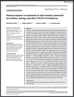 The dual mandate for many protected areas (PAs) to simultaneously promote recreation and conserve biodiversity may be hampered by negative effects of recreation on wildlife. However, reports of these effects are not consistent, presenting a knowledge gap that hinders evidence-based decision-making. We used camera traps to monitor human activity and terrestrial mammals in Golden Ears Provincial Park and the adjacent University of British Columbia Malcolm Knapp Research Forest near Vancouver, Canada, with the objective of discerning relative effects of various forms of recreation on cougars (Puma concolor), black bears (Ursus americanus), black-tailed deer (Odocoileus hemionus), snowshoe hares (Lepus americanus), coyotes (Canis latrans), and bobcats (Lynx rufus). Additionally, public closures of the study area associated with the COVD-19 pandemic offered an unprecedented period of humanexclusion through which to explore these effects. Using Bayesian generalized mixed-effects models, we detected negative effects of hikers (mean posterior estimate = 0.58, 95% credible interval [CI] 1.09 to 0.12) on weekly bobcat habitat use and negative effects of motorized vehicles (estimate = 0.28, 95% CI 0.61 to 0.05) on weekly black bear habitat use. We also found increased cougar detection rates in the PA during the COVID-19 closure (estimate = 0.007, 95% CI 0.005 to 0.009), but decreased cougar detection rates (estimate = 0.006, 95% CI 0.009 to 0.003) and increased black-tailed deer detection rates (estimate = 0.014, 95% CI 0.002 to 0.026) upon reopening of the PA. Our results emphasize that effects of human activity on wildlife habitat use and movement may be species- and/or activity-dependent, and that camera traps can be an invaluable tool for monitoring both wildlife and human activity, collecting data even when public access is barred. Further, we encourage PA managers seeking to promote both biodiversity conservation and recreation to explicitly assess trade-offs between these two goals in their PAs.