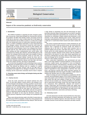 The COVID-19 pandemic is impacting all parts of human society. Like everyone else, conservation biologists are concerned first with how the pandemic will affect their families, friends, and people around the world. But we also have a duty to think about how it will impact the world's biodiversity and our ability to protect it, as well as how it might affect the training and careers of conservation researchers and practitioners. As editors of Biological Conservation, we have heard first-hand from colleagues, authors, and reviewers around the world about the problems they are facing, and their concerns for their students, their staff, and their research projects. Some of our colleagues have become infected with the virus. Field and lab work have largely shut down, while teaching and other communications have moved online, with consequences for training, data collection, and networking that are still unclear. Our colleagues and the media report some examples of reduced human pressures on natural ecosystems, cleaner air and water, and wildlife reclaiming contested habitats. Beyond the direct and immediate consequences of this particular virus, some have also started to think about emerging infectious diseases and their links with biodiversity loss, human activities, and issues of sustainability.