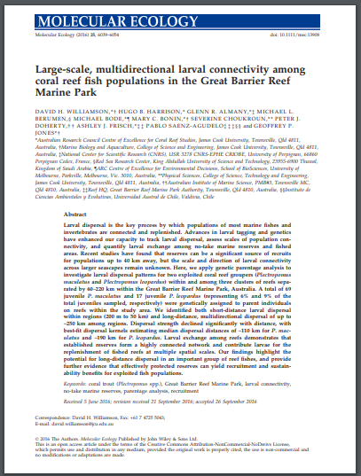 Larval dispersal is the key process by which populations of most marine fishes and invertebrates are connected and replenished. Advances in larval tagging and genetics have enhanced our capacity to track larval dispersal, assess scales of population connectivity, and quantify larval exchange among no-take marine reserves and fished areas. Recent studies have found that reserves can be a significant source of recruits for populations up to 40 km away, but the scale and direction of larval connectivity across larger seascapes remain unknown. Here, we apply genetic parentage analysis to investigate larval dispersal patterns for two exploited coral reef groupers (Plectropomus maculatus and Plectropomus leopardus) within and among three clusters of reefs separated by 60–220 km within the Great Barrier Reef Marine Park, Australia. A total of 69 juvenile P. maculatus and 17 juvenile P. leopardus (representing 6% and 9% of the total juveniles sampled, respectively) were genetically assigned to parent individuals on reefs within the study area. We identified both short-distance larval dispersal within regions (200 m to 50 km) and long-distance, multidirectional dispersal of up to ~250 km among regions. Dispersal strength declined significantly with distance, with best-fit dispersal kernels estimating median dispersal distances of ~110 km for P. maculatus and ~190 km for P. leopardus. Larval exchange among reefs demonstrates that established reserves form a highly connected network and contribute larvae for the replenishment of fished reefs at multiple spatial scales. Our findings highlight the potential for long-distance dispersal in an important group of reef fishes, and provide further evidence that effectively protected reserves can yield recruitment and sustainability benefits for exploited fish populations.