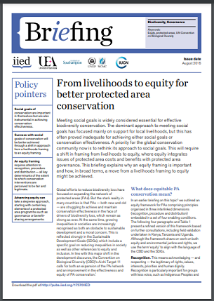 Meeting social goals is widely considered essential for effective biodiversity conservation. The dominant approach to meeting social goals has focused mainly on support for local livelihoods, but this has often proved inadequate for achieving either social goals or conservation effectiveness. A priority for the global conservation community now is to rethink its approach to social goals. This will require a shift in framing from livelihoods to equity, where equity integrates issues of protected area costs and benefits with protected area governance. This briefing explains why an equity framing is important and how, in broad terms, a move from a livelihoods framing to equity might be achieved.