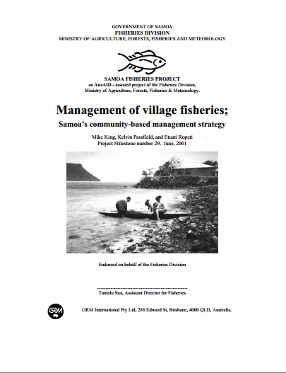 King, M., Passfield, K. and Ropeti, R. 2001. Management of Village Fisheries; Samoa’s Community-Based Management Strategy