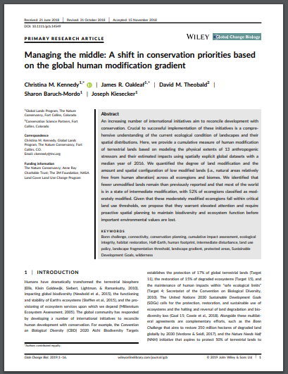 An increasing number of international initiatives aim to reconcile development with conservation. Crucial to successful implementation of these initiatives is a comprehensive understanding of the current ecological condition of landscapes and their spatial distributions. Here, we provide a cumulative measure of human modification of terrestrial lands based on modeling the physical extents of 13 anthropogenic stressors and their estimated impacts using spatially explicit global datasets with a median year of 2016. We quantified the degree of land modification and the amount and spatial configuration of low modified lands (i.e., natural areas relatively free from human alteration) across all ecoregions and biomes. We identified that fewer unmodified lands remain than previously reported and that most of the world is in a state of intermediate modification, with 52% of ecoregions classified as moderately modified. Given that these moderately modified ecoregions fall within critical land use thresholds, we propose that they warrant elevated attention and require proactive spatial planning to maintain biodiversity and ecosystem function before important environmental values are lost.