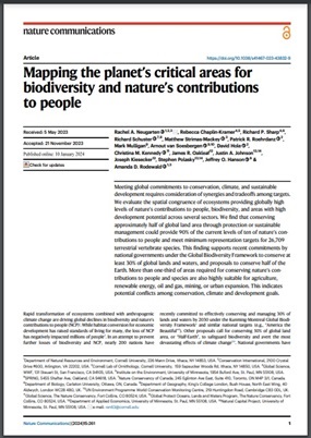 Meeting global commitments to conservation, climate, and sustainable development requires consideration of synergies and tradeoffs among targets. We evaluate the spatial congruence of ecosystems providing globally high levels of nature’s contributions to people, biodiversity, and areas with high development potential across several sectors. We find that conserving approximately half of global land area through protection or sustainable management could provide 90% of the current levels of ten of nature’s contributions to people and meet minimum representation targets for 26,709 terrestrial vertebrate species. This finding supports recent commitments by national governments under the Global Biodiversity Framework to conserve at least 30% of global lands and waters, and proposals to conserve half of the Earth. More than one-third of areas required for conserving nature’s contributions to people and species are also highly suitable for agriculture, renewable energy, oil and gas, mining, or urban expansion. This indicates potential conflicts among conservation, climate and development goals.