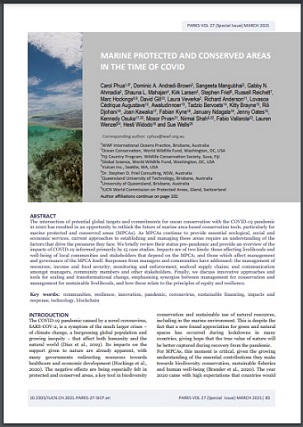 The intersection of potential global targets and commitments for ocean conservation with the COVID-19 pandemic in 2020 has resulted in an opportunity to rethink the future of marine area-based conservation tools, particularly for marine protected and conserved areas (MPCAs). As MPCAs continue to provide essential ecological, social and economic services, current approaches to establishing and managing these areas require an understanding of the factors that drive the pressures they face. We briefly review their status pre-pandemic and provide an overview of the impacts of COVID-19 informed primarily by 15 case studies. Impacts are of two kinds: those affecting livelihoods and well-being of local communities and stakeholders that depend on the MPCA; and those which affect management and governance of the MPCA itself. Responses from managers and communities have addressed: the management of resources; income and food security; monitoring and enforcement; seafood supply chains; and communication amongst managers, community members and other stakeholders. Finally, we discuss innovative approaches and tools for scaling and transformational change, emphasising synergies between management for conservation and management for sustainable livelihoods, and how these relate to the principles of equity and resilience.