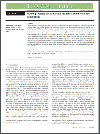 With marine biodiversity declining globally at accelerating rates, maximising the effectiveness of conservation has become a key goal for local, national and international regulators. Marine protected areas (MPAs) have been widely advocated for conserving and managing marine biodiversity yet, despite extensive research, their benefits for conserving non-target species and wider ecosystem functions remain unclear. Here, we demonstrate that MPAs can increase the resilience of coral reef communities to natural disturbances, including coral bleaching, coral diseases, Acanthaster planci outbreaks and storms. Using a 20-year time series from Australia’s Great Barrier Reef, we show that within MPAs, (1) reef community composition was 21–38% more stable; (2) the magnitude of disturbance impacts was 30% lower and (3) subsequent recovery was 20% faster that in adjacent unprotected habitats. Our results demonstrate that MPAs can increase the resilience of marine communities to natural disturbance possibly through herbivory, trophic cascades and portfolio effects.