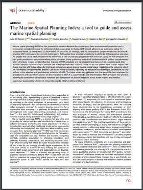 Marine spatial planning (MSP) has the potential to balance demands for ocean space with environmental protection and is increasingly considered crucial for achieving global ocean goals. In theory, MSP should adhere to six principles, being: (1) ecosystem-based, (2) integrated, (3) place-based, (4) adaptive, (5) strategic, and (6) participatory. Despite nearly two decades of practice, MSP continues to face critical challenges to fully realize these principles, hindering its ability to deliver positive outcomes for people and nature. Here, we present the MSP Index, a tool for assessing progress in MSP processes based on MSP principles that can guide practitioners in operationalizing these principles. Using qualitative analysis of fundamental MSP guides, complemented with a literature review, we identified key features of MSP principles and developed these features into a scoring guide that assesses progress relative to each principle. We trialed and validated the MSP Index on six case studies from distinct regions. We found that the MSP Index allows for high-level comparison across diverse marine spatial plans, highlighting the extent to which MSP principles have permeated practice. Our results reveal successes, especially for the place-based principle, and failures to fully adhere to the adaptive and participatory principles of MSP. The Index serves as a guidance tool that would be best employed by practitioners and can inform science on the evolution of MSP. It is a user-friendly tool that translates MSP principles into practice, allowing for assessment of individual initiatives and comparison of diverse initiatives across ocean regions and nations.