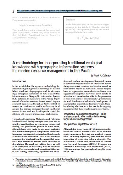 Calamia, M. 1999. A Methodology for Incorporating Traditional Ecological Knowledge with Geographic Information Systems for Marine Resource Management in the Pacific. SPC Traditional Marine Resource Management and Knowledge Information Bulletin #10.