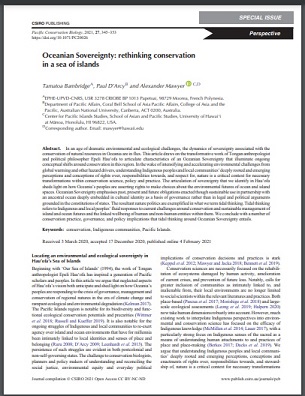 In an age of dramatic environmental and ecological challenges, the dynamics of sovereignty associated with the conservation of natural resources in Oceania are in flux. This article draws on the transformative work of Tongan anthropologist and political philosopher Epeli Hau‘ofa to articulate characteristics of an Oceanian Sovereignty that illuminate ongoing conceptual shifts around conservation in this region. In the wake of intensifying and accelerating environmental challenges from global warming and other hazard drivers, understanding Indigenous peoples and local communities’ deeply rooted and emerging perceptions and conceptions of rights over, responsibilities towards, and respect for, nature is a critical context for necessary transformations within conservation science, policy and practice. The articulation of sovereignty that we identify in Hau‘ofa sheds light on how Oceania’s peoples are asserting rights to make choices about the environmental futures of ocean and island spaces. Oceanian Sovereignty emphasises past, present and future obligations enacted though sustainable use in partnership with an ancestral ocean deeply embedded in cultural identity as a basis of governance rather than in legal and political arguments grounded in the constitutions of states. The resultant nature politics are exemplified in what we term tidal thinking. Tidal thinking refers to Indigenous and local peoples’ fluid responses to current challenges around conservation and sustainable management of island and ocean futures and the linked wellbeing of human and non-human entities within them. We conclude with a number of conservation practice, governance, and policy implications that tidal thinking around Oceanian Sovereignty entails.