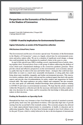 The Environmental and Resource Economics special issue “Economics of the Environment in the Shadow of Coronavirus” comes at a hugely critical time for environmental economists and policy makers alike. We are in a situation of significant social change, a change that could potentially lay the foundation for mankind’s future in the years to come. As part of this special issue, ERE is trialing a novel, experimental form of article, drawing together short, focused pieces from a wide group of authors addressing the plethora of issues which such a fundamental challenge as the coronavirus pandemic generates. These provide critical and reflective perspectives on the environmental, socio-economic and policy paths that may be taken in the near and further future—strategies that could lead mankind either on roads to a much more sustainable development, or along paths that could bring about more instability, inequality and further environmental pressures. This innovative article combines short, policy-relevant and less technical papers that deal with specific aspects and provide clear recommendations for policy makers and suggestions for future research alike. The target audiences are policy makers and companies, but also researchers who want quick yet sufficiently detailed knowledge about particular analyses relating to COVID-19 and issues in environmental economics. We hope that the articles contained within this Perspectives collection provide the necessary information for policy makers to take wise decisions for our future, and for researchers the knowledge to help guide policy makers in their decisions.