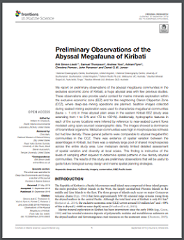 We report on preliminary observations of the abyssal megafauna communities in the exclusive economic zone of Kiribati, a huge abyssal area with few previous studies. These observations also provide useful context for marine minerals exploration within the exclusive economic zone (EEZ) and for the neighboring Clarion Clipperton Zone (CCZ), where deep-sea mining operations are planned... The results of this study are preliminary observations that will be useful to guide future biological survey design and marine spatial planning strategies.
