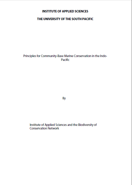 Parks, J, Aalbersberg, W and Salafsky, N (editors). 2001. Principles for Community-Based Marine Conservation in the Indo-Pacific. University of the South Pacific Press. Suva, Fiji.