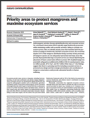 Anthropogenic activities threaten global biodiversity and ecosystem services. Yet, area-based conservation efforts typically target biodiversity protection whilst minimising conflict with economic activities, failing to consider ecosystem services. Here we identify priority areas that maximise both the protection of mangrove biodiversity and their ecosystem services. We reveal that despite 13.5% of the mangrove distribution being currently strictly protected, all mangrove species are not adequately represented and many areas that provide disproportionally large ecosystem services are missed. Optimising the placement of future conservation efforts to protect 30% of global mangroves potentially safeguards an additional 16.3 billion USD of coastal property value, 6.1 million people, 1173.1 Tg C, and 50.7 million fisher days yr−1. Our findings suggest that there is a pressing need for including ecosystem services in protected area design and that strategic prioritisation and coordination of mangrove conservation could provide substantial benefits to human wellbeing.