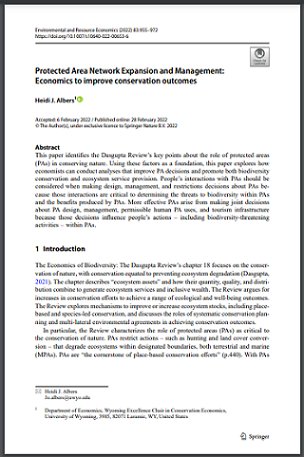This paper identifies the Dasgupta Review’s key points about the role of protected areas (PAs) in conserving nature. Using these factors as a foundation, this paper explores how economists can conduct analyses that improve PA decisions and promote both biodiversity conservation and ecosystem service provision. People’s interactions with PAs should be considered when making design, management, and restrictions decisions about PAs because those interactions are critical to determining the threats to biodiversity within PAs and the benefits produced by PAs. More effective PAs arise from making joint decisions about PA design, management, permissible human PA uses, and tourism infrastructure because those decisions influence people’s actions – including biodiversity-threatening activities – within PAs.