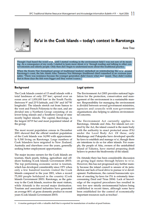 Though I had heard the word ra’ui, until I started working in the environment field I was not sure of its meaning. As a consequence of my work, I started to learn more about ra’ui through reading and talking to other conservationists and elderly people. Only then did I begin to understand more about this traditional practice. When the Koutu Nui (formalised group of traditional leaders) embarked on reintroducing the ra’ui around Rarotonga’s coast, the late Akaiti Ama Tamarua Nui Mataiapo (traditional chief) remarked to an overseas journalist, “There was resistance because the younger generation didn’t know what rau'i meant. They didn’t realize that in those days the fish were bigger and they weren’t scarce.”