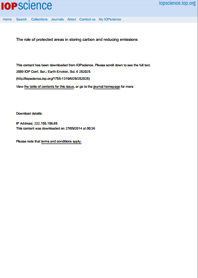 Campbell, A., Dickson, B., Gibbs, H., Hansen, M., Kapos, V., Lysenko, I., Miles, L. Scharlemann, J. 2009. The Role of Protected Areas in Storing Carbon and Reducing Emissions. IOP Conf. Series: Earth and Environmental Science 6.