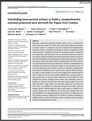 Systematic conservation planning identifies priority areas to cost-effectively meet conservation targets. Yet, these tools rarely guide wholesale declaration of reserve systems in a single time step due to financial and implementation constraints. Rather, incremental scheduling of actions to progressively build reserve networks is required. To ensure this incremental action is guided by the original plan, and thus builds a reserve network that meets all conservation targets, strategic scheduling, and iterative planning is needed. We explore the issue of scheduling conservation actions using the national scale conservation plan for Papua New Guinea (PNG), commissioned by the PNG Conservation and Environment Protection Authority that identifies a comprehensive set of priority areas that meet conservation targets in both the land and sea. As part of the planning process a subset of areas were identified in collaboration as priorities for immediate action—termed areas of interest (AOIs). However, the extent to which targets are met if action stopped after implementing the AOIs is unknown. We test three possible implementation scenarios based on these priority areas to measure target achievement and shortfalls. We then consider how iterative planning would interact with scheduling actions to identify new long-term priorities that will meet missing targets. Our results show that while a large number of conservation targets are met within the AOIs there are shortfalls for protecting threatened and range restricted endemic species. Meeting targets for these would require an updated set of national priorities and an additional 13% of land area compared with if all areas identified in the original assessment were protected in a single time step. This provides important insights into the benefits of strategic scheduling of implementation, as well as the need for capacity to monitor action and update priorities as implementation proceed.