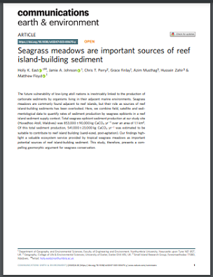 The future vulnerability of low-lying atoll nations is inextricably linked to the production of carbonate sediments by organisms living in their adjacent marine environments. Seagrass meadows are commonly found adjacent to reef islands, but their role as sources of reef island-building sediments has been overlooked. Here, we combine field, satellite and sedimentological data to quantify rates of sediment production by seagrass epibionts in a reef island sediment supply context. Total seagrass epibiont sediment production at our study site (Huvadhoo Atoll, Maldives) was 853,000 ± 90,000 kg CaCO3 yr−1 over an area of 1.1 km2. Of this total sediment production, 541,000 ± 23,000 kg CaCO3 yr−1 was estimated to be suitable to contribute to reef island building (sand-sized, post-agitation). Our findings highlight a valuable ecosystem service provided by tropical seagrass meadows as important potential sources of reef island-building sediment. This study, therefore, presents a compelling geomorphic argument for seagrass conservation.