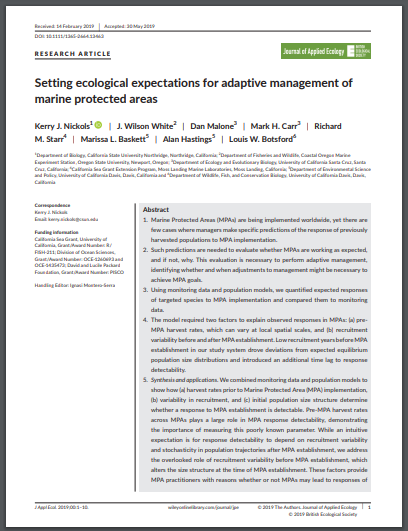 Marine Protected Areas (MPAs) are being implemented worldwide, yet there are few cases where managers make specific predictions of the response of previously harvested populations to MPA implementation. Such predictions are needed to evaluate whether MPAs are working as expected, and if not, why. This evaluation is necessary to perform adaptive management, identifying whether and when adjustments to management might be necessary to achieve MPA goals. Using monitoring data and population models, we quantified expected responses of targeted species to MPA implementation and compared them to monitoring data. The model required two factors to explain observed responses in MPAs: (a) pre‐ MPA harvest rates, which can vary at local spatial scales, and (b) recruitment variability before and after MPAestablishment. Low recruitment years before MPA establishment in our study system drove deviations from expected equilibrium population size distributions and introduced an additional time lag to response detectability. Synthesis and applications. We combined monitoring data and population models to show how (a) harvest rates prior to Marine Protected Area (MPA) implementation, (b) variability in recruitment, and (c) initial population size structure determine whether a response to MPA establishment is detectable. Pre‐MPA harvest rates across MPAs plays a large role in MPA response detectability, demonstrating the importance of measuring this poorly known parameter.