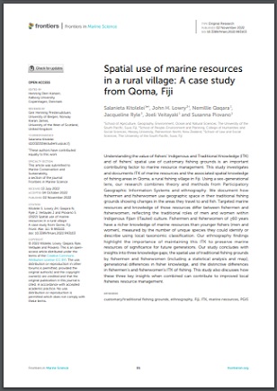 Understanding the value of fishers’ Indigenous and Traditional Knowledge (ITK) and of fishers’ spatial use of customary fishing grounds is an important contributing factor to marine resource management. This study investigates and documents ITK of marine resources and the associated spatial knowledge of fishing areas in Qoma, a rural fishing village in Fiji. Using a sex-generational lens, our research combines theory and methods from Participatory Geographic Information Systems and ethnography. We document how fishermen and fisherwomen use geographic space in their traditional fishing grounds showing changes in the areas they travel to and fish. Targeted marine resources and knowledge of those resources differ between fishermen and fisherwomen, reflecting the traditional roles of men and women within Indigenous Fijian (iTaukei) culture. Fishermen and fisherwomen of ≥60 years have a richer knowledge of marine resources than younger fishers (men and women), measured by the number of unique species they could identify or describe using local taxonomic classification. Our ethnography findings highlight the importance of maintaining this ITK to preserve marine resources of significance for future generations. Our study concludes with insights into three knowledge gaps; the spatial use of traditional fishing grounds by fishermen and fisherwomen (including a statistical analysis and map), generational differences in fisher knowledge, and the distinctive differences in fishermen’s and fisherwomen’s ITK of fishing. This study also discusses how these three key insights when combined can contribute to improved local fisheries resource management.