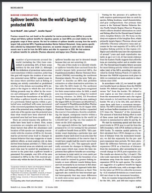 Previous research has cast doubt on the potential for marine protected areas (MPAs) to provide refuge and fishery spillover benefits for migratory species as most MPAs are small relative to the geographic range of these species. We test for evidence of spillover benefits accruing from the world’s largest fully protected MPA, Papahānaumokuākea Marine National Monument. Using species-specific data collected by independent fishery observers, we examine changes in catch rates for individual vessels near to and far from the MPA before and after its expansion in 2016. We find evidence of spillover benefits for yellowfin (Thunnus albacares) and bigeye tuna (Thunnus obesus).