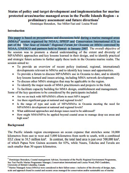 Benzaken, D., Miller-Taei, S., Wood, L. 2007. Status of Policy and Target Development and Implementation for Marine Protected Areas/Marine Managed Areas in the Pacific Islands Region - A Preliminary Assessment and Future Directions