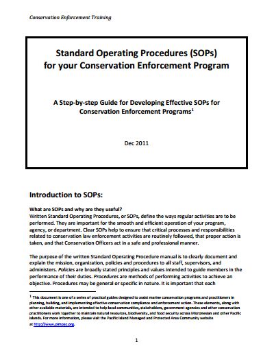 This guide is intended to assist government conservation and resource management agencies identify a process for developing good standard operating procedures (SOPs) within its conservation law enforcement program.