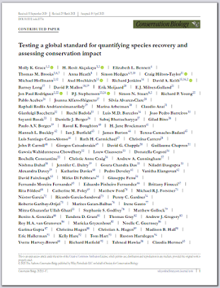 Recognizing the imperative to evaluate species recovery and conservation impact, in 2012the International Union for Conservation of Nature (IUCN) called for development of a“Green List of Species” (now the IUCN Green Status of Species). A draft Green Status framework for assessing species’ progress toward recovery, published in 2018, proposed2 separate but interlinked components: a standardized method (i.e., measurement againstbenchmarks of species’ viability, functionality, and pre-impact distribution) to determine current species recovery status (herein species recovery score) and application of that method to estimate past and potential future impacts of conservation based on 4 metrics (conservation legacy, conservation dependence, conservation gain, and recovery potential). We tested the frame-work with 181 species representing diverse taxa, life histories, biomes, and IUCN RedList categories (extinction risk). Based on the observed distribution of species’ recovery scores, we propose the following species recovery categories: fully recovered, slightly depleted, moderately depleted, largely depleted, critically depleted, extinct in the wild, and indeterminate. Fifty-nine percent of tested species were considered largely or critically depleted. Although there was a negative relationship between extinction risk and species recovery score, variation was considerable. Some species in lower risk categories were assessed as farther from recovery than those at higher risk. This emphasizes that species recovery is conceptually different from extinction risk and reinforces the utility of the IUCN Green Status of Species to more fully understand species conservation status. Although extinction risk did not predict conservation legacy, conservation dependence, or conservation gain, it was positively correlated with recovery potential. Only 1.7% of tested species were categorized as zero across all 4 of these conservation impact metrics, indicating that conservation has, or will, play a role in improving or maintaining species status for the vast majority of these species. Based on our results, we devised an updated assessment framework that introduces the option of using a dynamic baseline to assess future impacts of conservation over the short term to avoid misleading results which were generated in a small number of cases, and redefines short term as 10 years to better align with conservation planning. These changes are reflected in the IUCN Green Status of Species Standard.